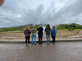 Post tour, we stopped for a quick bite to eat, and then on to Thingvellir National Park to see Almannagja Gorge, where two tectonic plates converge (North America and Europe). They both continue to move in opposite directions, West and East respectively. There are some gorgeous formations, cracks, faults, and fissures. Next, on to the Geysir geothermal area. While the Geysir geyser last “erupted” in 1935, the smaller Strokkur geyser still erupts 30 meters up every 7-8 minutes regularly. It will still take you by surprise. It did me. This area is full of hot springs, steaming vents, and fissures—and flowers, because it is technically summer. Really beautiful! No time to nap yet, one more big thing on today’s agenda, the Gullfoss waterfalls. While the rain kept us from seeing it’s signature “golden glow”, they are truly gorgeous and well worth a look.